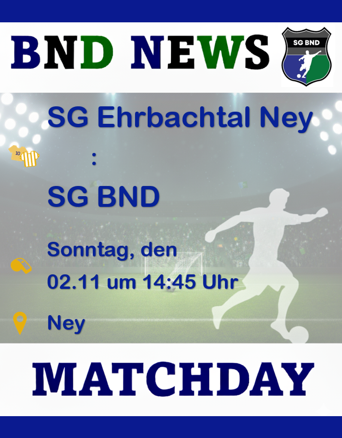 SG Ehrbachtal Ney empfängt SG BND Am kommenden Sonntag, den 02.11.2025, um 14:45 Uhr steht ein echtes Kracher-Duell auf dem Programm! Die SG Ehrbachtal Ney (aktuell Platz 4) trifft auf die SG Niederburg (aktuell Platz 3). Beide Teams haben aktuell 24 Punkte auf dem Konto, Niederburg liegt nur aufgrund des besseren Torverhältnisses knapp vor Ney....Read More
