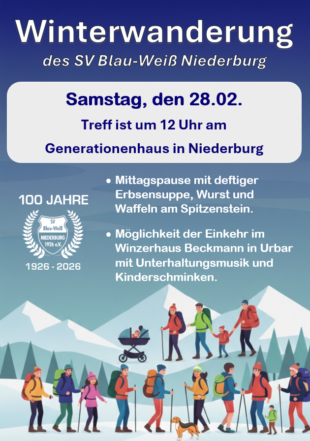 Im Rahmen unseres 100-jährigen Jubiläums lädt der SV Blau-Weiß Niederburg alle Mitglieder, Freunde und Gönner herzlich zur traditionellen Winterwanderung ein.