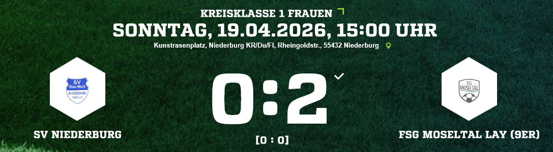 Am Sonntag, den 19. 04. stand für die Niederburgerinnen ein wichtiges Heimspiel an. Der Gegner hieß FSG Moseltal-Lay. Von Anfang an war klar, dass es ein Spiel auf Augenhöhe wird, welches im Kampf um den 2. Tabellenplatz eine entscheidende Rolle spielt. Die Niederburgerinnen konnten in der ersten Halbzeit ein Chancenplus verzeichnen. Es wurde mehrmals aus der Ferne auf das Tor der Gäste geschossen. Leider waren die Torabschlüsse jedoch nicht platziert und zwingend genug. Die Gäste hielten gut dagegen, konnten aber keine nennenswerte Torchance erspielen. Die Defensive der Niederburgerinnen hatte die schnellen und agilen Spielerinnen der FSG gut im Griff.In der zweiten Halbzeit änderte sich das Bild. Moseltal erspielte sich mehr Torchancen und wurde zunehmend gefährlicher. Die Damen des SVN ließen sich in die Defensive drängen und zeigten nur noch wenige offensive Spielaktionen mit Zug zum Tor. In der 72. Minute gelang es den Gästen dann nach einer Ecke durch einen guten Kopfball zum 1:0 in Führung zu gehen. Zehn Minuten später schloss eine Spielerin der FSG dann nach einem gelungen Dribbling abgeklärt in die untere Ecke ab und besiegelte damit den Endstand.Somit zieht die FSG in der Tabelle an Niederburg vorbei und sichert sich den 2. Platz mit einem Punkt.