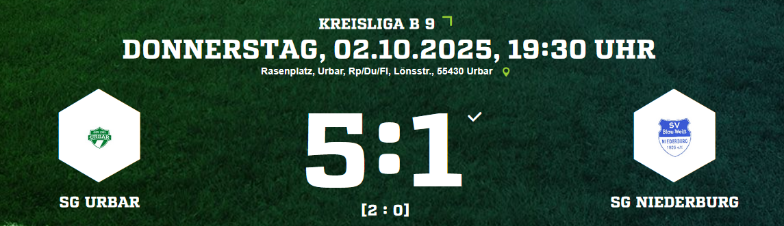 Für unsere SG Niederburg steht am Donnerstag, den 02.10.2025 (19:30 Uhr), ein Härtetest an. Wir sind zu Gast beim ungeschlagenen Nachbarn, der SG Urbar/ Werlau. Urbar steht nach sieben Spielen mit 19 Punkten an der Spitze, doch auch wir reisen mit breiter Brust und einer makellosen Bilanz von drei Siegen und drei Remis an. Die...Read More